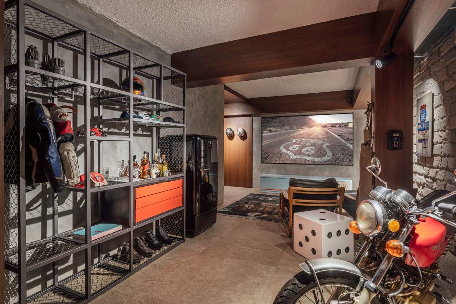 Inspirado nos anos de 1970, Garagem do Motociclista mescla garagem e estar num conceito vintage, com toques de irreverência e de rusticidade, como convém aos apaixonados por motos. A mistura de materiais brutos, aliada à tecnologia de automação, som e imagem, além de peças de design único de Aristeu Pires, dão o toque personalizado, bem ao perfil do usuário.