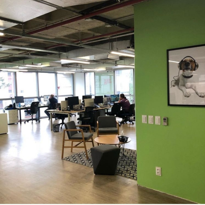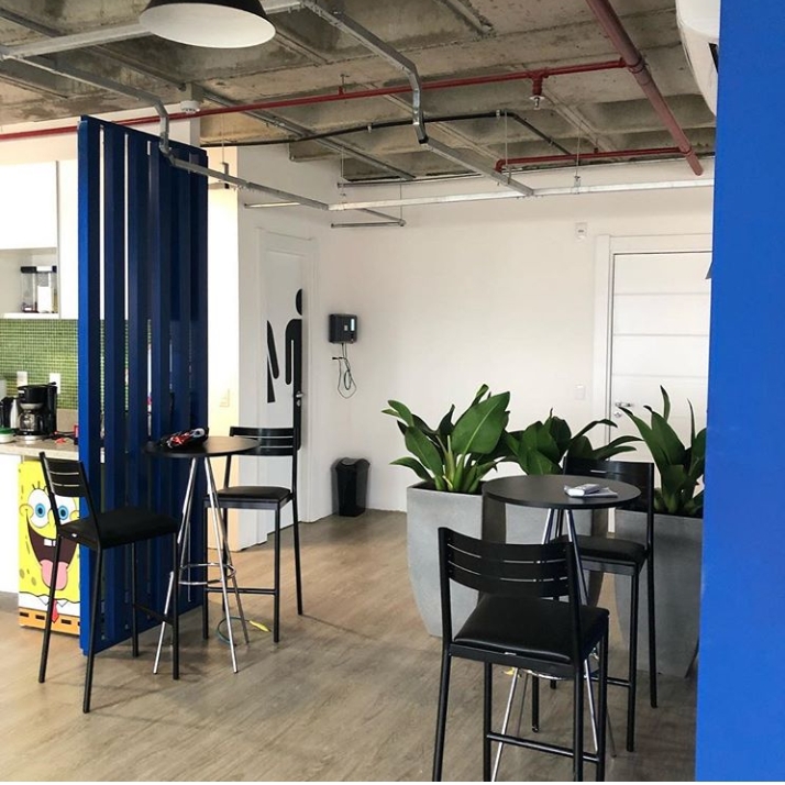 O projeto combina materiais  – como concreto e instalações aparentes, cores vivas e parede de tijoletas, lembrando os antigos galpões, bem ao estilo industrial –  de forma despojada,  trazendo jovialidade e dinamismo aos espaços, que trazem uma comunicação e um bem estar bem jovial.