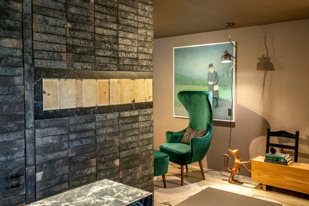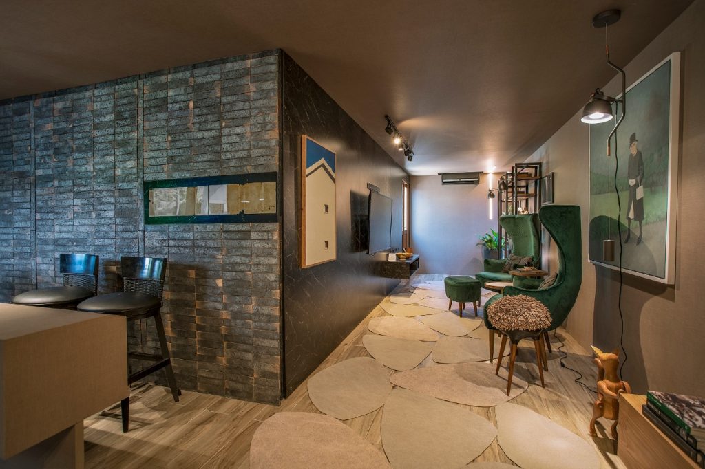 Inusitado. Assim pode ser descrito o Espaço Intelbras, de Rico Mendonça, na CASACOR SC Florianópolis. Misto de bilheteria e galeria de arte, o ambiente foi montado em containers, mostrando, ao mesmo tempo, uma arquitetura pop-up, transitória, atual e atemporal. A contemporaneidade é marcada pelos tons fortes e textura rústica do Terra Catarina Carvoeira, da Olívia Revestimentos Sustentáveis, em contraste com obras de arte, mobiliário de design assinado e cores vivas.
